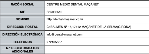 En cumplimiento de la Ley 34/2002, de 11 de julio, de Servicios de la Sociedad de la Información y de Comercio Electrónico (LSSI-CE), CENTRE MEDIC DENTAL MAÇANET informa que es titular del sitio web. De acuerdo con la exigencia del artículo 10 de la citada Ley, CENTRE MEDIC DENTAL MAÇANET informa de los siguientes datos: